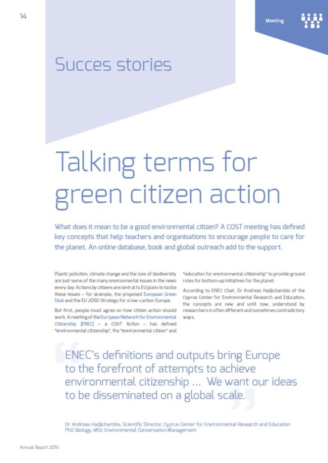 What does it mean to be a good environmental citizen? A COST meeting has defined key concepts that help teachers and organisations to encourage people to care for the planet. An online database, book and global outreach add to the support. https://www.cost.eu/…/u…/2020/04/COST-Annual-report-2020.pdf Pages 14-15 European Network for Environmental Citizenship Cost Action Ca16229 …