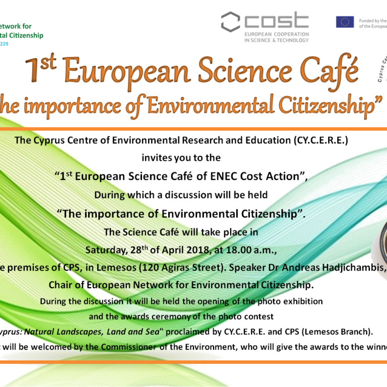 1st European Science Café of ENEC Cost Action Title: 1st European Science Café of ENEC Cost Action Location: Lemesos, Cyprus Time: Saturday, 28th of April 2018, at 18.00 a.m. Objective: Discussion about the “The importance of Environmental Citizenship”, during which it was held the opening of the photo exhibition and the awards ceremony of the photo contest “Cyprus: Natural Landscapes, Land and Sea” proclaimed by CY.C.E.R.E. and…