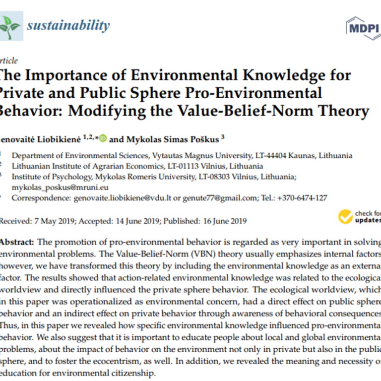 The Importance of Environmental Knowledge for Private and Public Sphere Pro-Environmental Behavior: Modifying the Value-Belief-Norm Theory Abstract The promotion of pro-environmental behavior is regarded as very important in solving environmental problems. The Value-Belief-Norm (VBN) theory usually emphasizes internal factors; however, we have transformed this theory by including the environmental knowledge as an external factor.…